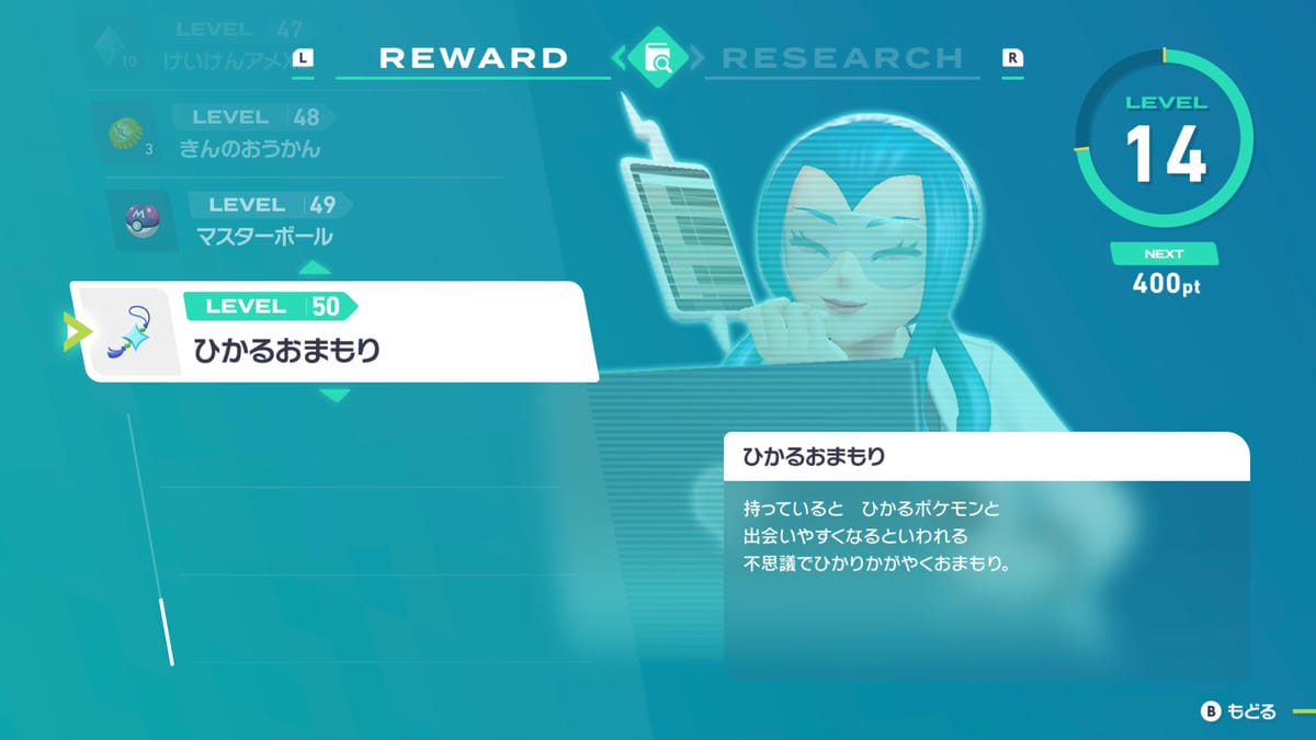 モミジリサーチのレベル50の報酬が、色違いポケモンと遭遇しやすくなるアイテム「ひかるおまもり」です。