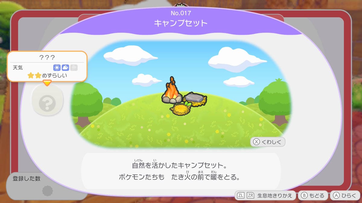 てるてるポワルン(晴れ)×2、キャンプファイヤー×1、きのみいりバスケット×1、高いところ×1