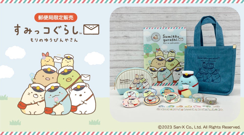「もりのゆうびんやさん」をテーマに、配達員風の恰好をしてお手紙を運ぶすみっコたちがデザインされた「貯金箱(とかげ)」「刺繍缶バッジ」「コーデュロイトート」「シェルポーチ」「マスキングテープセット」「5インデックスフォルダー」の6アイテムです。